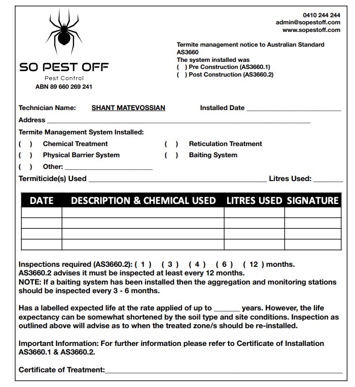 You should have a termite management certificate, a durable notice (typically found inside the meter box), and documentation from the builder or pest control company. These documents will detail the type of system installed, the installation date, and the maintenance schedule.
